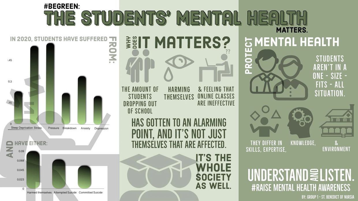 Mental health awareness is important as it tackles sensitive topics that aims to let people know the struggles of everyone, especially the students. Ever since the pandemic started, a lot of students' mental health got affected by it. We created this infographics to raise awareness about the different struggles of the students as well as we aim to inform everyone the effects of mental health to students.